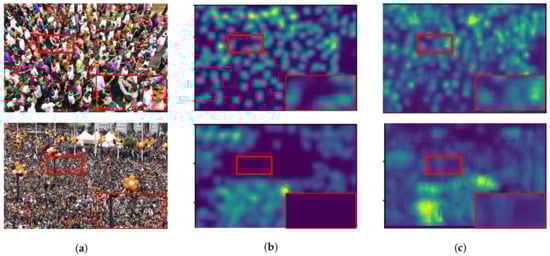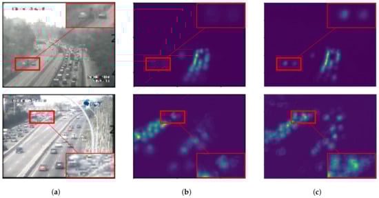 With the advantage of a dilated convolution, it is expected to reduce information loss and increase image quality in a density map. To prove our hypothesis, we evaluated two backbone networks with and without dilated convolution as shown in Figure 3a,b, represented as -A and -B, respectively. Both of them were added to a backward connection with in Equation (6). In the experiment, -A and -B were tested for vehicle and people counting as shown in Figure 13 and Figure 14, respectively. These figures consist of input images (Figure 13a,b) and their predicted density maps produced by -A (Figure 13b and Figure 14b) and -B (Figure 13c and Figure 14c) with backward connections. For vehicle counting, empirical results show that dilated convolution generates more detail in predicted density, especially in high crowd density with small vehicles within red rectangular boxes. On the other hand, more people are formulated in predicted density by -B. Therefore, it indicates that the error from under-counting error is reduced in the proposed method.