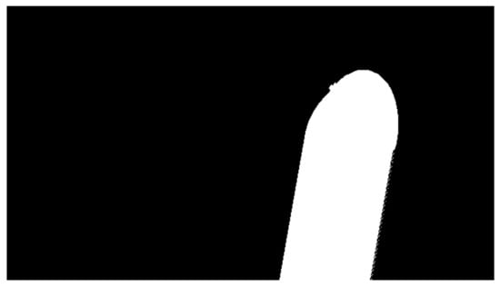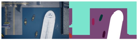 It can be seen how each category is labeled with a different color on Figure 10. The land category has a turquoise color, the large vessel has a white color, the water is purple, and the tugboats have different colors. Multiple instances of the same category must be colored uniquely and still maintain the same category label for the Mask R-CNN network to distinguish between different instances. In the process of generating box coordinates of all object instances, the annotated image is transformed into a set of binary masks, with each binary mask representing an object instance. A binary mask is represented as a matrix with a shape of , m being the width and n being the height of the image. The color channels are discarded, and the location of the object by the value (see Figure 11).