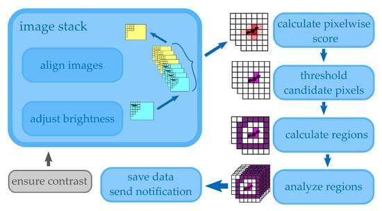 Figure 1 gives a rough overview of the image processing steps that have to be undertaken to get the final result. Firstly, the images are organized in a first-in first-out stack with a fixed number of images per camera. Then, images are aligned to ensure they can be compared on a pixel-by-pixel basis. The last preprocessing step is to adjust the brightness, taking advantage of experimental knowledge about the signal-to-noise ratios. Then, a pixel-wise score is calculated and the pixels are separated by a threshold to find regions with a higher probability of being a potential fatality. These regions are given as input to more specific algorithms where the final decision is made. If the probability is high enough, the data are saved and a notification is sent to do an optional manual search to verify the ground truth. These steps will be outlined as sections below, including an initial section to describe the planned measurement setup.