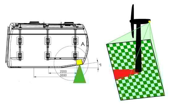 Camera system is mounted on back of nacelle (left) and senses area underneath wind turbine (right). Tower produces a dead corner which cannot be recorded by system (red projection).