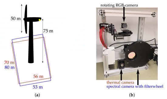 (a) dimensions of wind turbine; FOV (= field of view) thermal camera (red); FOV spectral camera (blue). (b) Prototype of camera system for collision victim detection.