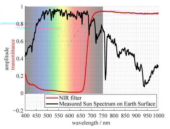 In Figure 7, the transmission curve of the NIR filter is plotted with a representation of the sun spectrum on the earths surface. The spectral energy of the sun is getting lower in the desired region of about to about . Together with the low-pass NIR filter it is cutting off the desired region on both sides. The local peak at about is irrelevant if all of the hardware is considered, namely the transmittance of the lens and the quantum efficiency of the sensor. The quantum efficiency drops from about at to below at for the Sony IMX183 sensor used in our spectral camera.
