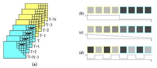 (a) Picture stack with new (cyan) and old (yellow) images, (b) gray values over time for a potential strike victim, (c) change in brightness over time, (d) alternating gray values, e.g., moving grass.
