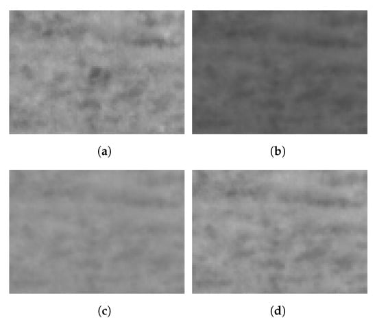 Because the compared images are taken with a considerable time delay (e.g., 10 s), the brightness may change due to changing illumination conditions. Clouds may move in front of the sun (VIS camera) and change the brightness of the whole image. This is shown in Figure 9, where (a) was taken about one minute after (b). Furthermore, in the middle of (a), a phantom can be seen. To compensate for the brightness, the median of (b) can be adjusted to (a); this can be seen in (c). The median was taken, as we are interested in a constant brightness of the background over all compared images. Possible fatalities are treated as outliers in this case and do not influence the brightness compensation. Different light conditions additionally result in changes of the contrast. A histogram equalization (d) of all images is able to compensate for the contrast. While this looks like the better compensation to the human eye, the artificial redistribution of the gray values based on another image may means the differences of the absolute values loose their meaning, destroying the detection accuracy of the region analysis. This is why the median is the better choice for compensation and will be applied for the images in the stack before they will be handed over to the pixel-wise detection in the next section.