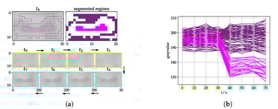 (a) Tool for manual segmentation of inner (pink) and outer (purple) region for analysis. to (newest image) shows image stack according to Figure 8; images are zoomed to relevant part and are with VIS camera (b) gray values over time of segmented regions starting from with .