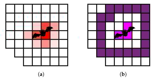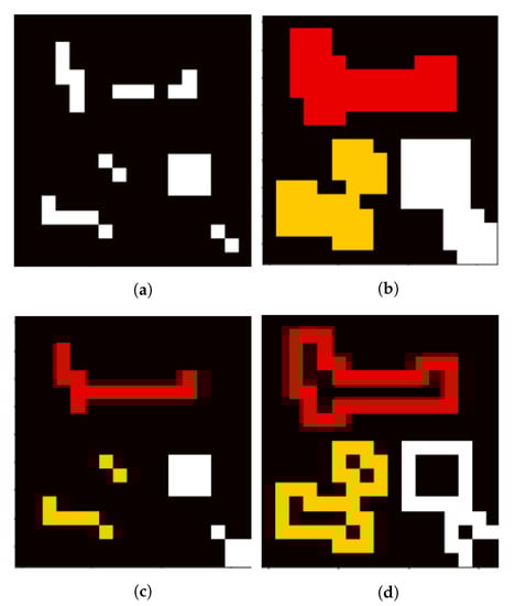 To separate high from low scores, adaptive thresholding [22] is used. This method helps to find local maxima instead of using a global threshold which is not always appropriate e.g., when a part of the image is in the shadow or the grass is not uniformly heated (for the LWIR camera). This produces a binary map like in Figure 14a. The thresholded pixels are on the one hand not necessarily representing the whole strike victim and on the other hand are not providing information about the surrounding area. Therefore, it is necessary to define regions based on the pixels for further analysis. As a pre-processing step morphological opening can be applied to get rid of very small pixel clusters. Then dilation is applied to connect very close pixels and also include the surrounding of the potential strike victim (Figure 14b). In this state, a connected components analysis is done to derive distinct regions, allegorized in different colors here. By erosion and subtraction it is possible to further split the regions into the inner, outer and full region (Figure 14b–d respectively). The described order of the morphological operations and the labelling is crucial to receive an equal number of inner, outer, and full regions, because morphological operations are able to change the number of connected components in general.
