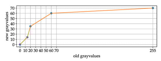 Test data made clear that it makes sense to adjust the image gray value distribution for the difference image in the first part of Equation (1). We called this function LUTshift as it is basically a LUT (lookup table). By manually analyzing test data, it can be seen that the difference representing an artificial collision victim is often in the range from about 15 to 30. Lower values are more often a result of noise. Values above 70 are very rarely fatalities so it helps to lower their score to not overestimate them. Figure 12 shows that a maximal value of 255 maps to 70.