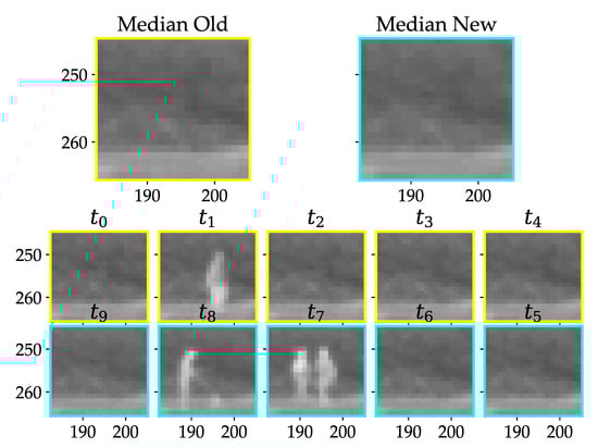 To calculate the pixel score for the LWIR camera, the median over time is taken for the old (Section 2.4) and for the new images. The score is their difference. The median helps to get rid of outliers like an animal moving through the scene (Figure 13).