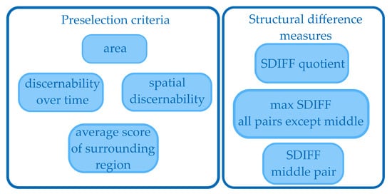 Additional measures for preselection are the discernibility over time and space by their gray value and the average score of the surrounding region. For the LWIR camera we assume the strike victim to be warmer than its surrounding. This would mean that the inner pixels are both significantly warmer than the outer pixels and warmer than the full region of the old images. The definition of the criteria is listed in Table 1.
