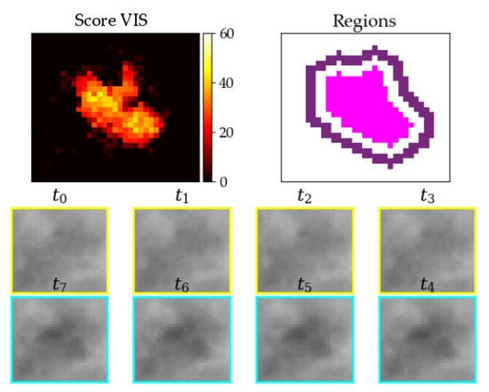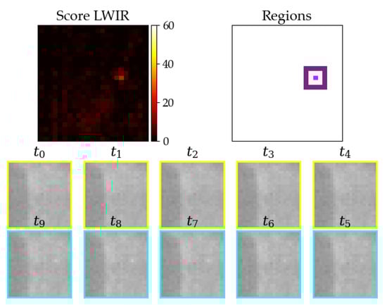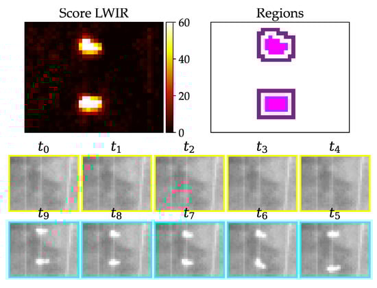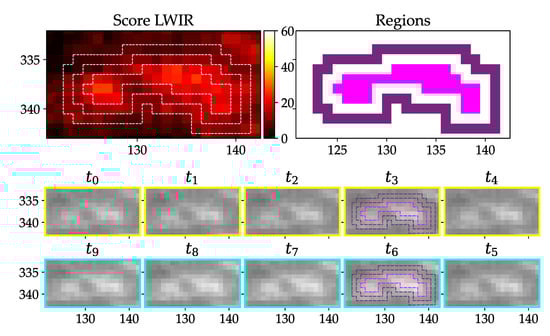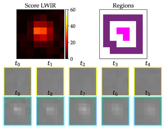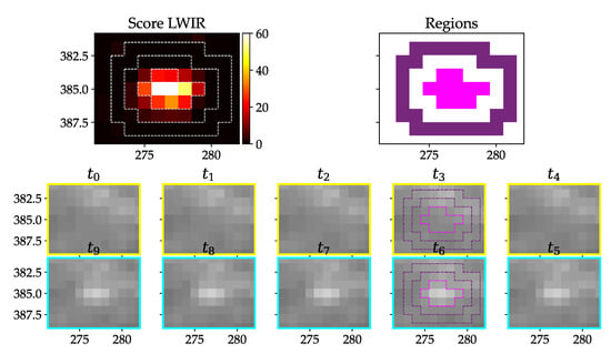 Warm test object (body temperature) with about 5 cm lengths lying in grass; upper left: resulting score from pixel-wise detection; upper right: derived inner (pink) and outer (purple) region; two lower rows: image stack from oldest () to newest () image with assumed strike happening between and .