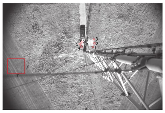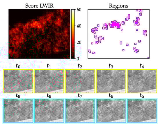 Test videos show that there is a dependency between the measured values and wind gusts, because the angle of the grass influences the main direction of heat radiation of the grass surface (LWIR camera). An example can be seen in Figure 17, where the average LWIR score around the single regions is unusually high compared to a true positive detection. We therefore neglect detections if the average score within a certain distance is above a defined threshold.