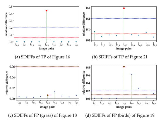 Grass getting illuminated by sun differently over time, which leads to a false positive detection after preselection, but obviously image content stays same from to .