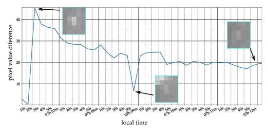 The ideally expected sequence of pixel gray values as shown in Figure 8b, showing a sudden transition from a constant high gray value to a constant low gray value. The gray values can also change due to external reasons like different illumination by sunlight and the resulting change of exposure time and gain of the camera. This functionality is necessary to stay within the detectable range. However, these changes are comparably slow and should either be small enough or happen over more than one image (Figure 8c). Other unwanted signals arise through moving objects like grass in the wind or animals walking through the scene (Figure 8d). These signals should not lead to a high detection score (Equation (1)).