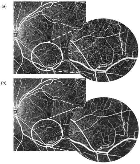 - Kadomoto, S.; Uji, A.; Muraoka, Y.; Akagi, T.; Tsujikawa, A. Enhanced Visualization of Retinal Microvasculature in Optical Coherence Tomography Angiography Imaging via Deep Learning. J. Clin. Med. 2020, 9, 1322. [Google Scholar] [CrossRef]