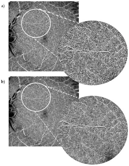10 × 10 mm OCT-A scan of the superficial capillary plexus in a patient with systemic lupus erythematosus retinopathy. Baseline image (a) vs. denoised image (b).