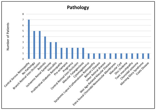 The patients had a mean age of 48 years (range: 15–87 years). Twenty-three were male and 27 were female. Thirty-nine patients were Caucasian, 6 were black, and 5 were Asian. Thirty-two scans (65%) had evident signs of retinal pathology, with 17 scans (35%) found to have no pathology. The various pathologies present in the 49 scans are summarised in Figure 3.