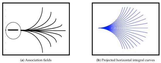 Projections of horizontal integral curves approximate the association fields from the experiment of Field, Hayes and Hess []. They are generated by the sub-Riemannian model geometry proposed by Citti and Sarti []. Figures are adapted from [,].