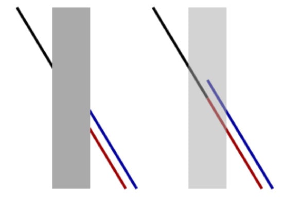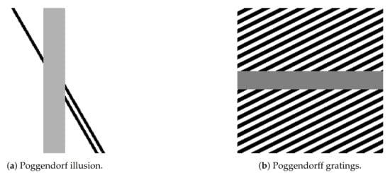 In this work, we focus on illusions induced by contrast induction and orientation misalignments, with a particular focus on the well-known Poggendorff illusion and its variations, see Figure 2. This is a geometrical optical illusion [,] in which a misaligned oblique perception is induced by the presence of a central bar [].