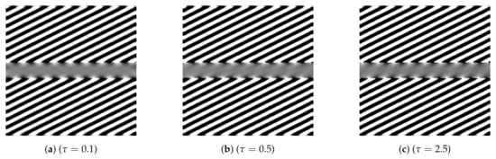 Sensitivity to the parameter for τ for (sR-LHE) model for the visual perception of Figure 3b. The completion inside the central grey bar changes from geometrical (inpainting type) to illusory (perception type). Parameters: τ varies from 0.1 to 5, α = 6, σμ = 1, Δt = 0.15, Δτ = 0.01.