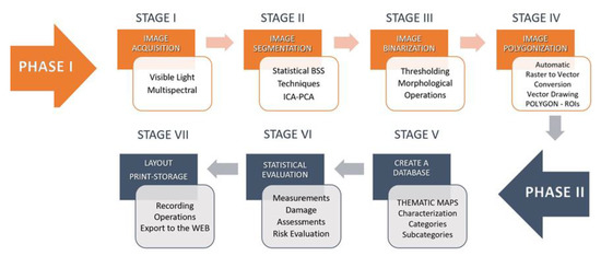 To date, QGIS has been assessed as the most appropriate tool to support each step of the methodology, as in this framework the operator has all the necessary image analysis tools, combining high potential and ease of use. In a previous, empirical and preliminary study preceding the formal methodology [46] we tested the BBS algorithms coupled to neural networks. As future work, we plan to investigate additional algorithms, and in order to ensure a more general applicability of the results we expect to replicate the experiment on a larger number of case studies and the implementation of well-known blind methods to assess the reliability and stability of the results achieved. Another future development could be to integrate our method with some recent experiences and advanced strands of research that are trying to overcome some of the limitations of documentation, offering web-based solutions/platforms able to perform the operations of survey (mapping) of conservation, restoration and preservation in a single environment/system; also by exploiting three-dimensional models [47,48,49,50].