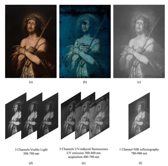 Phase I, stage 1—Ecce Homo by Bernardo Strozzi, oil on canvas, 1620–1622, 105 × 75 cm2: (a) Standard RGB; (b) UV-induced fluorescence; (c) NIR reflectography; (d–f) Respective spectral Channels of the acquired images. Images captured by Paolo Triolo, under permission of the Ministry of Cultural Heritage and Activities and Tourism, National Gallery of Palazzo Spinola, Genova, Italy.