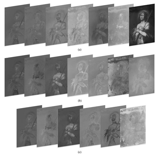 By following stage 1 of the proposed method, the painting was captured in three different modalities, under visible light illumination (Figure 2a), UV-fluorescence (Figure 2b) and Near-Infrared Reflectography 780–980 nm (Figure 2c). The fluorescence image was subtracted of the visible stray light to highlight the regions that really produce fluorescence under ultraviolet illumination (see [19,45] for details). In the second stage, the three images were processed by PCA and ICA; the output images are shown in Figure 3a,b. A further attempt with ICA has been made on a subset of six channels, obtained excluding the infrared and resulting in the outputs of Figure 3c. It is essential to make explicit that every image produced by the statistical processing no longer corresponds to a specific wavelength range of, but is a recombination of their intensities, highlighting one or more of the ROIs required, which appear in different gray levels. The 20 output images in Figure 3a–c are the new data set that the restorer can inspect for study and feature recognition.