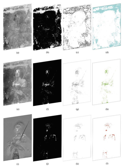After inspecting the output images, the restorer chose those where the significant regions are most noticeable. These images, reported in Figure 4a,e,i, show some features related to the materials used: Figure 4a highlights the pictorial retouches performed on the background and Figure 4e highlights the pictorial retouches performed on the body of Christ. These two features in the original data were visually superimposed in the same spectral channel, while in this phase they are separated in different outputs, despite having been operated at the same time. Therefore, we can say that segmentation is due to the different pigments used for retouching. In fact, the figure of Christ has likely been restored using titanium white pigment, and the background has been restored using varnish colors. Even without (destructive) chemical analysis or any other more specialized technique, image processing has allowed us to distinguish between regions that look similar in the acquired channels. Analogously, in Figure 4i–l, the red lacquer used for the blood of Christ is highlighted.