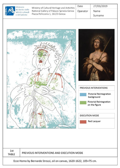 The artworks undergo profound changes in time due to several factors: the natural aging of materials, pathologies of degradation, wrong restoration or remaking that introduce new materials and chemical interactions. For this reason, any technique for detecting and reporting what is not directly visible or perceptible is an essential means of diagnostic investigation. This need is currently widely met by techniques inspired by remote sensing, such as multispectral and hyperspectral imaging, as they can provide information on the composition of materials without taking samples. The technical information related to the nature and conditions of the artwork is transcribed in the graphic documentation.