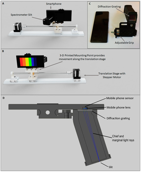 To date, very low-cost spectrometers have been designed for incorporation with smartphone devices. These devices have largely been designed as teaching aids, providing easily accessible, educational set-ups, for example, Public Lab [16], presents a simple papercraft spectrometer, where a cardboard housing and a simple diffraction grating utilising a digital video disc (DVD) fragment are used to capture spectral datasets from a smartphone camera. Whilst this simple design does allow for spectral datasets to be observed, its basic components limit its potential uses, for example, the use of a DVD fragment as a diffraction grating substitute can introduce potential data quality issues, resulting from scattered light interference as well as transmittance shifts leading to the intensity variations of imaged objects at each wavelength of interest [17,18,19]. Despite these limitations, this basic design highlights the potential availability of low-cost, accessible, smartphone-based data collection.