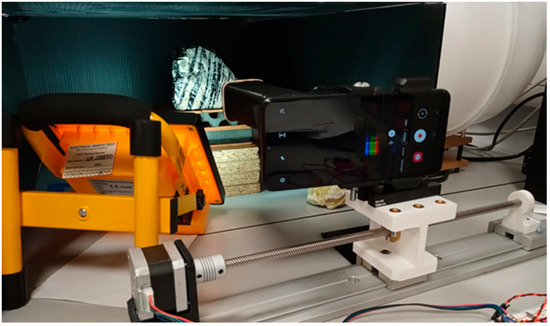 The Hyperspectral Smartphone mounted on the translation stage ready to image an obsidian flow banded ash tuff rock within a laboratory setting.