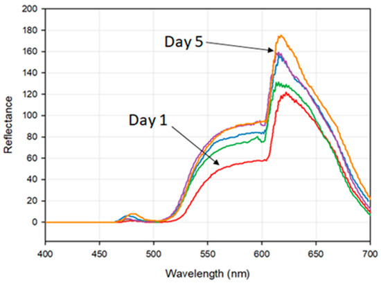 The observed spectral response curves of a healthy apple over the five-day measurement period. Note the general increase in reflectance over the measurement period and the absorption features present at ca. 550 nm and ca. 650 nm.
