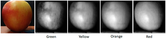 Spatial datasets of the apple across different wavelengths. Note the variations in pigments across the spectrum.