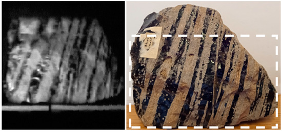 Volcanic rock images were also captured with the Hyperspectral Smartphone. These images were acquired as a means of demonstrating the device’s ability to identify variations and feature changes across a target object’s surface. Figure 5 shows the hyperspectral data captured of an obsidian flow banded ash tuff. As Figure 5 shows, this target has clear variations present across its surface. These variations are clearly replicated in the hyperspectral data, adding further support to the capabilities of this low-cost design. The banding across the rock is easily recognisable within the hyperspectral image, allowing for the straightforward identification of the individual flow bands.