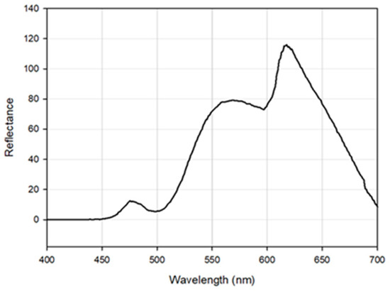 To further demonstrate the spectral capabilities of this instrument, a sulphur rock was imaged. Sulphur was chosen due to its distinctive spectral response where a distinct increase in reflectance is evident from ca. 500 nm [29]. Figure 6 shows the spectral response of Sulphur collected by the Hyperspectral Smartphone. This figure clearly shows the expected increase in reflectance from ca. 500 nm, emphasising the capabilities of this instrument. The additional variations across the spectrum are likely to be the result of variations present across the surface of the sulphur target used due to the presence of colour variations across the rock’s surface, as highlighted in Figure 7. However, the key reflectance feature at ca. 500 nm remains prominent within the captured dataset.