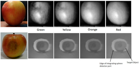 Figure 8 provides a side-by-side comparison of apple targets captured by both instruments. As this figure demonstrates, both the Hyperspectral Smartphone and the laboratory-based hyperspectral imager are capable of detecting pigment variations across this type of target. When comparing the two spatial datasets, the Hyperspectral Smartphone appears to be capable of greater image resolution, however, it should be noted that the optical system present within the laboratory-based instrument represents a basic set-up [1], and is, therefore, capable of improved image clarity, subject to the inclusion of an upgraded lens system. The Hyperspectral Smartphone benefits from the built-in optical system present within the chosen smartphone. As most smartphones are now capable of high quality image capture, it makes sense that the Hyperspectral Smartphone would be superior in the context of this comparison.