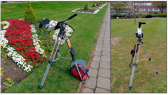 The above sections have demonstrated the Hyperspectral Smartphone to be a valuable low-cost instrument capable of high quality, accurate hyperspectral data collection within a laboratory setting. We now aimed to further test its capabilities as a robust, field-portable instrument. To do this, the Hyperspectral Smartphone, with the translation stage, was mounted onto a tripod to allow for stable data capture and the translation stage was converted to battery power. Figure 9 shows the Hyperspectral Smartphone in the field ready for data collection.