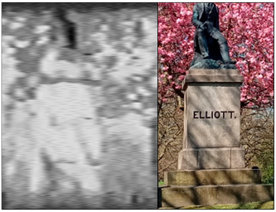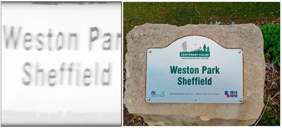 In the field, a variety of targets were imaged in order to determine the Hyperspectral Smartphone’s abilities in a field setting at a range of different working distances. For this data collection, measurements were completed within Weston Park, Sheffield. This site was chosen due to the wide range of potential targets available without the need for extended travel, allowing for initial field tests to be completed under COVID-19 travel restrictions. Datasets were captured at both short ca. 1 m and longer ca. 20 m working distances. Figure 10 shows the results obtained over a short working distance for a distinct target, in this case a sign within the park. It is clear from this figure that the Hyperspectral Smartphone is capable of clearly defining target object features, in this instance replicating the writing clearly within the spatial data.