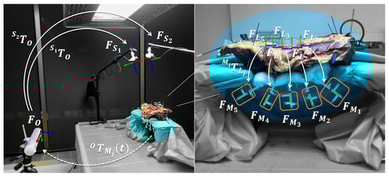 Setup overview with coordinate frames (F) and transformations (T). Dedicated markers () are attached to spine levels L1–L5 (), enabling individual tracking () by the optical tracking system (OTS; ). The surgical site is viewed from the top by two RGB-D sensors (). Extrinsic calibrations between OTS and RGB-D sensors () can be found intraoperatively using the method described in Section 2.3. The relative marker poses w.r.t. the anatomy () are determined in a postoperative CT (Section 2.6).
