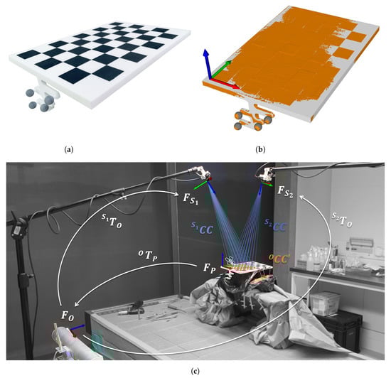 The extrinsic calibration process and the respective coordinate frames, transformations and point sets are illustrated in Figure 2c. Note that this is a one-time process, as long as the relative position of the RGB-D sensor and the OTS is maintained stationary. The calibration phantom was positioned on top of the anatomy such that the OTS could detect the sphere markers and the RGB-D sensors could detect the chessboard pattern. Along with the pose, the OTS provides a geometry registration error. If it was below 0.1 mm, the phantom pose for the OTS was stored as . Otherwise, the phantom position was slightly varied until the error criteria was fulfilled. For each of the RGB-D sensors, the chessboard pattern was detected in both, the left and the right RGB camera frame using OpenCV’s (version 4.2) findChessboardCorners functionality []. Based on the intrinsic and extrinsic camera parameters of the RGB-D sensors, computed with a manufacturer-provided application, the inner 40 chessboard corners could be determined in 3D using OpenCV’s triangulatePoints functionality: and . The corresponding points for the OTS are inferred by multiplying the ground truth 3D chessboard coordinates by , yielding . Thereby, even a small error in propagates with each row of the chessboard. Preliminary experiments indicated the removal of the last three rows from all point sets to increase accuracy while maintaining robustness. The extrinsic calibration between OTS and each RGB-D sensor was then found with Horn’s absolute orientation method [,]: