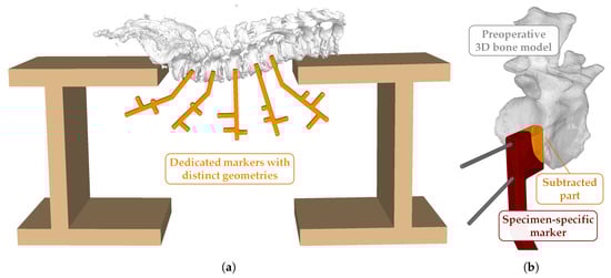 Marker construct design: Five dedicated markers were designed for individual tracking of levels L1–L5. The markers had four branches for distinct geometries and were shaped according to their position within the setup in a way that they neither interfered with one another nor the C-shaped wooden jig (Figure 3a). The part for fixation to the anatomy followed the key concept for registration in patient-specific instruments []. It was molded as a mirror model, such that it could fit to the vertebrae of interest in an specific position and orientation. This was achieved by subtraction of the vertebra from its corresponding marker 3D model using Boolean difference operation []. Two slightly converging drill canals at the top of each marker allowed for fixation to the vertebral bodies with K-wires according to the specimen-specific plan (Figure 3b). For each specimen, the preoperative 3D bone models were used in the CASPA software to create the specimen- and vertebra-specific marker constructs. The resulting 3D models were printed in the same way as the calibration phantom (Section 2.3). After manufacturing, the markers were equipped with infrared-reflecting spheres (Ø 6.4 mm; OptiTrack, NaturalPoint Inc., Corvallis, OR, USA).