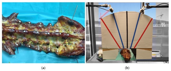 For the later assessment of the TRE (Section 2.6), and after removal of all pedicle screws, the surgeon inserted a number of white push-pins (i.e., thumb tacks) into both transverse processes as well as the spinous process of levels L1–L5 (Figure 4a). A static scene was then captured from twelve standardized viewpoints, from which each RGB-D sensor covered six. First, the stereo baseline of the RGB-D sensors were aligned to the intersection of the axial and coronal planes, orthogonally facing the center of the surgical site at a distance of 600 mm. For the second viewpoints, the RGB-D sensors were inclined by +15° and −15°, respectively, and moved in superior/inferior direction such that they still faced the center of the surgical site at 600 mm distance. The third viewpoints were defined accordingly with inclinations of +30° and −30°. Viewpoints four to six followed the same protocol, but with the RGB-D sensors aligned to the intersection of the sagittal and coronal planes. All viewpoints were found using a custom-made cardboard template with angle markings (Figure 4b). After setting up each viewpoint, the OTS was calibrated to the RGB-D sensors and as well as (Figure 2c) were stored. Finally, a single frame was recorded.
