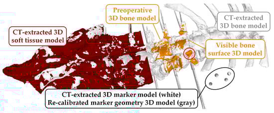 Data cleanup: As the postoperative CT contained K-wire artifacts from the attached markers and push-pins for TRE evaluation, the preoperative 3D bone models were employed as the reference for bony anatomy of levels L1–L5. Each preoperative 3D bone model was aligned individually to the CT-extracted 3D bone model (Table 1, Figure 5). Furthermore, despite the full exposure in nine out of ten specimens, parts of the bony anatomy were covered by residual soft tissue. Therefore, for accuracy evaluation, 3D models only describing the visible bone surface were created. From each aligned preoperative 3D bone model the 3D soft tissue model (Table 1, Figure 5) was subtracted using Boolean operations [] in CASPA, resulting in the desired 3D model of visible bone surface (Figure 5).