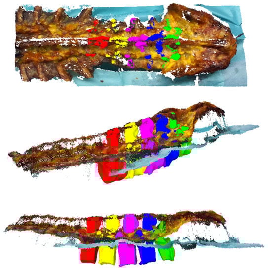 - The SR is a qualitative rating by the surgeon. A random sample of four recordings per specimen (10%) was selected for this purpose. For each recording, the first frame was selected (). The aligned preoperative 3D bone models (Figure 5) of levels L1–L5 were transformed to the space of either RGB-D sensor by (Equation (1)). Point clouds were extracted from the respective RGB-D frames. The surgeon then assessed the alignment of the bone models, i.e., the ground truth of our dataset, with the point cloud after the criteria: