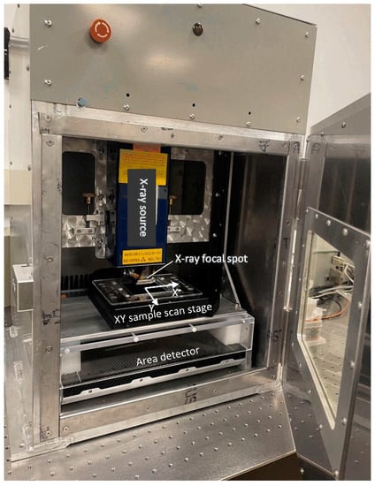 Referring to Figure 1, the scanner consists of a stationary micro-focus X-ray tube and a stationary flat panel detector. In between the two, a motorized sample stage travels in a plane that is ideally parallel to the image plane of the detector, and in directions that are ideally parallel to the rows or columns of the pixel matrix of the detector. The geometric magnification factor of the system is generally between 10× and 16× depending on the sample thickness []. The X-ray tube had a focal spot of 5 μm at the operating condition of 30 kV/160 μA. The source-to-detector distance was 126 mm, and the source-to-sample distance was typically between 8 and 20 mm depending on the sample size. The flat panel X-ray detector had a pixel size of 74.8 μm and matrix size of 3072 × 3840 [].