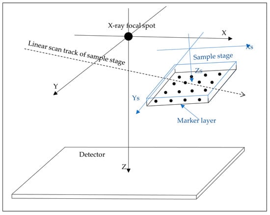 Tomosynthesis is an imaging technique that involves taking a series of X-ray images at different projection angles and reconstructing those images to form a stack of cross-sectional images at a range of depths []. It has the advantage of being able to resolve overlapping structures at different depths with relatively simple hardware. In the field of breast imaging, tomosynthesis has helped overcome challenges such as tissue superposition and false positive rates, thereby becoming widely accepted today [,]. Examples of other clinical applications besides mammography have also been published [,,]. A particular type of linear tomosynthesis scan involves moving the sample down a straight line parallel to a flat panel detector [,,,]. It is related in concept to an early form of tomography called planigraphy []. In the field of non-destructive testing, it is sometimes called laminography, because it is particularly suited to scanning objects of flat shapes [,,]. While this type of tomosynthesis was developed for materials testing and security screening, we were the first to realize that it was also advantageous for pathology samples that have flat shapes, such as standard paraffin embedding cassettes and tissue in Petri dishes. Therefore, we adapted it in the form of a linear micro tomosynthesis scanner for microscopy of tissue samples [,]. It provided 7 to 10 µm resolution with good soft-tissue contrast in a 15 min scan, which was an effective scouting tool to guide thin sectioning, staining and light microscopy [,]. The scanner is an X-ray cabinet system (Figure 1). The X-ray hardware is stationary, whereas the sample is carried on a motorized stage and scanned across a wide cone beam. The scanning geometry allows flat samples to be laid close to the X-ray source, to increase the geometric magnification and beam intensity through the sample. These factors then help to improve resolution and signal-to-noise ratio. Image reconstruction in tomosynthesis requires knowing the projection matrix from the 3D coordinates in the sample space to the 2D coordinates in the projection image. In practice, the geometry of the X-ray hardware and the sample deviate from the ideal design, and thus a calibration procedure is used to determine the deviations.