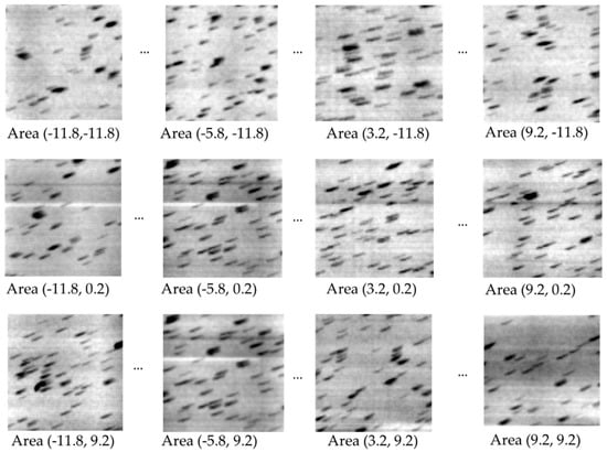 Illustration of how the in-plane tilt angle of the point markers varied with their locations in the field of view. The markers are glass microbeads. An array of reconstructed small areas of 1.4 × 1.4 mm size are shown, which are distributed on a rectangular grid across the full field-of-view. The numbers under each area are the x and y coordinates of the grid point in the sample coordinate system. The slices are off focus for the beads, such that each bead is defocused into a short line segment. The line segments are straight but tilted. The tilt is an effect of the deviations of the sample stage movement. The dependence of the tilt angle on the location of the beads provides sufficient information for estimating the 3D geometry of the scan.