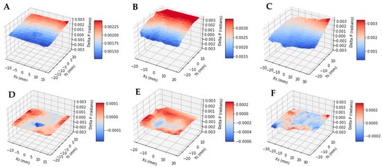 Surface plots of the measured in-plane deviation angles of the marker trajectories relative to the ideal horizontal direction, as a function of the marker position in the sample coordinate system. Plot (A) is from a scan of the typical speed of 0.0272 mm/s and range of 24 mm, (B) a scan of half the typical speed and range, and (C) a scan of twice the typical speed and range. Plots (D–F) are the residual deviation angles after subtracting the fit of the model of the scan geometry described by Equation (5) in Methods. The RMS of the residual deviation angles is <7.5% of the RMS of the original deviation angles. This indicates that the parametric model of Equation (5) adequately approximates the sample stage movement.