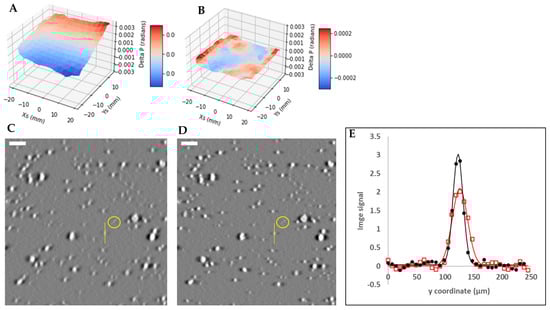 where in addition to the variables previously defined in Section 2.2, L is the total travel distance of the sample stage, xp and yp are the projected coordinates in the image plane based on the assumed movement of the sample stage through Equations (1)–(3), and Dispy is the y component of the displacement between the two images. This measurement was obtained for each small window in the field of view as defined in Section 2.4.