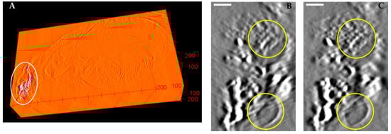 (A) is the reconstructed 3D stack of a paraffin-embedded mouse heart sample including an aorta segment. The white oval highlights a calcified lesion in the aorta. (B,C) are magnified views of the calcified lesion before and after applying geometric calibration. The white scale bar is equivalent to 160 µm. The yellow circles highlight the internal grain texture of the calcification and an air bubble.