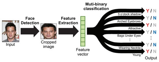 Face attribute estimation can be regarded as a multiple binary classification problem, as shown in Figure 1; that is, it is a problem of estimating whether a face has or does not have the attribute. Face attributes have multiple names depending on their color and shape, such as hair, or are expressed numerically, such as age. To deal with face attribute estimation as a binary classification problem, for example, hair can be decomposed into several classes such as black hair, blond hair, brown hair, and gray hair, and age can be simplified to young. Face attribute estimation consists of three processes: face detection, feature extraction, and classification [,]. Among these processes, feature extraction is the most important process, since it has the greatest impact on the estimation accuracy.